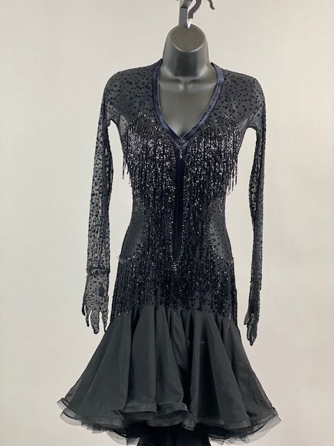 This is a beautiful black polka dots rhythm/Latin dress designed with gloves! This dress is a true beauty, it moves amazing on the dance floor. Trimmed with luxury European Crystals.