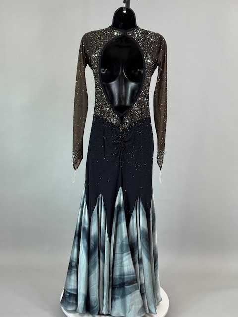 This is a beautiful bright black and silver smooth dress! It moves amazing on the dance floor. Trimmed with Austrian Crystals.