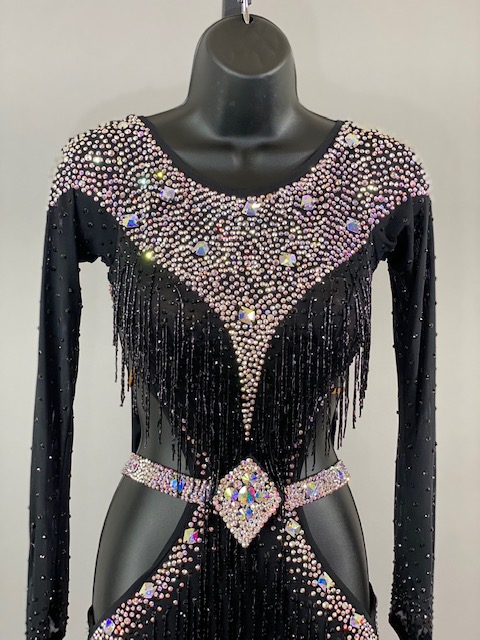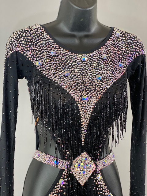 This is a beautiful black Rhythm/Latin Dress designed by Dore Designs! Very elegant and seductive! Moves amazing on the dance floor! Trimmed with Austrian crystals.
