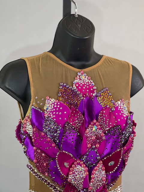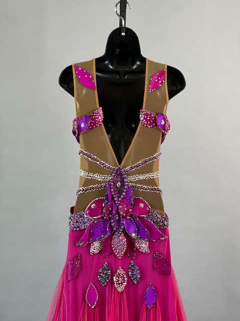This is a beautiful bright fuschia smooth dress designed by Dore Designs. This dress is a true beauty, unique style! Trimmed with luxury European Crystals.