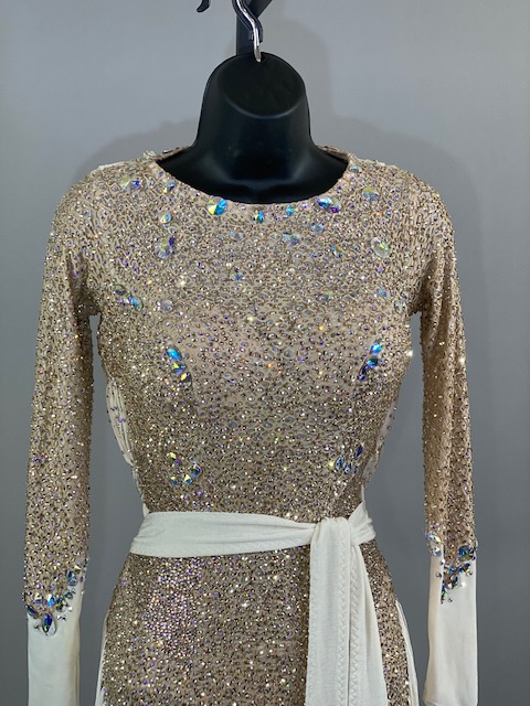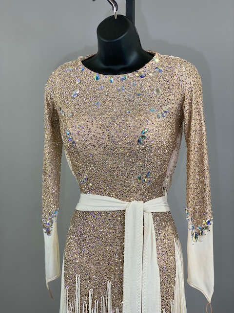 This is a beautiful champagne/beige Rhythm\/Latin dress! This dress is very unique, it’s stunning! It moves amazing on the dance floor! Trimmed with Luxury European Crystals.