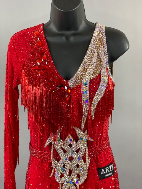 This is a beautiful red rhythm dress with feathers creating an amazing effect on the dance floor. This dress is stoned with Austrian Crystals. Dress designed by ARTI Designs.