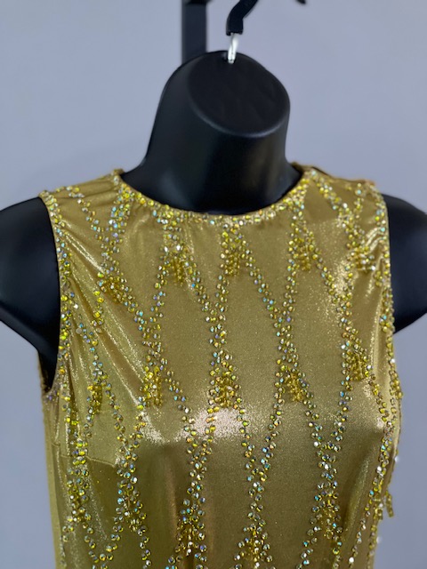 This is a beautiful gold Rhythm/Latin Dress designed by Sirius! It moves amazing on the dance floor, a true beauty! Trimmed with Austrian Crystals.