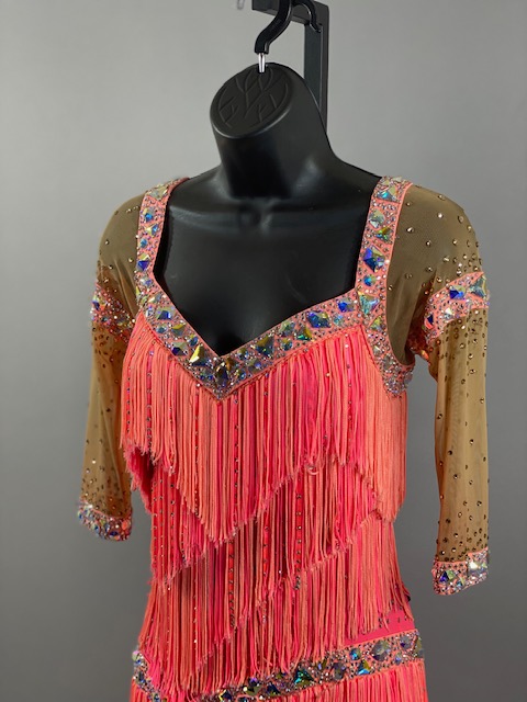 This salmon pink rhythm/latin dress is amazing! Fringes create beautiful movement on the dance floor. Great for your next competition or showcase. Designed by Tatiana, Anabell’s Dancewear.