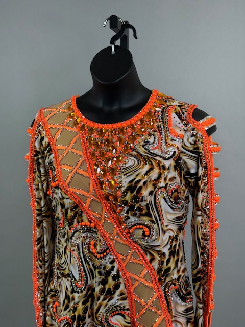 This is a beautiful leopard print combined with bright orange stones Rhythm/Latin dress designed by Artistry in Motion! It’s a bright unique style, an eye catcher on the dance floor. Trimmed with Austrian Crystals.