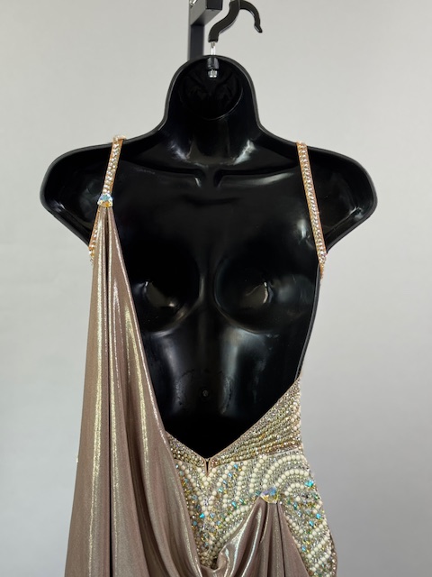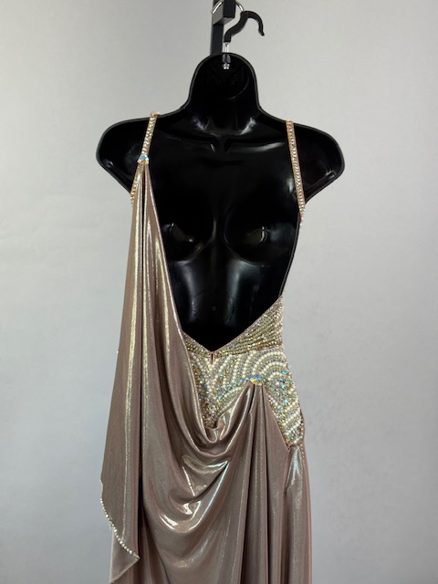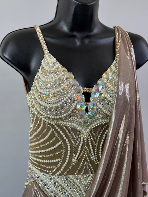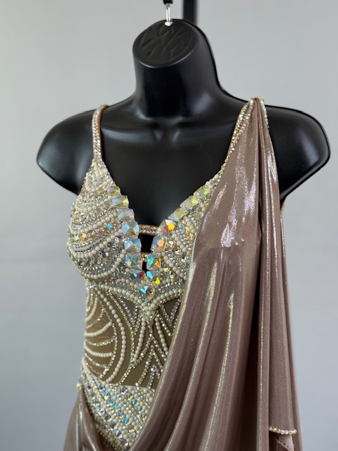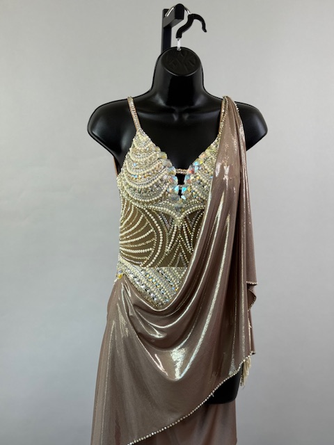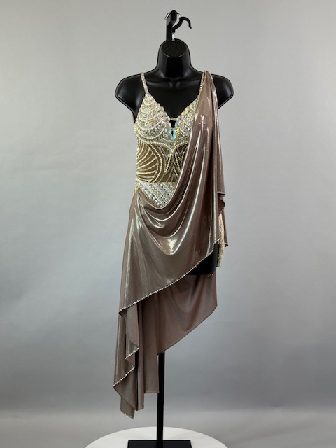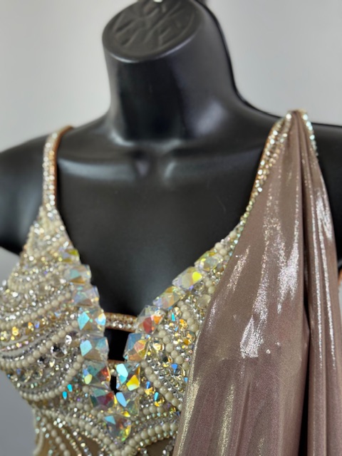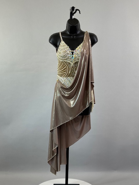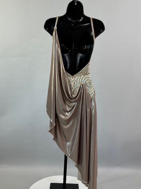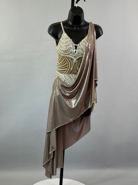 This is a stunning beige champagne Rhythm/Latin dress designed by ARTI Designs! Unique style, true beauty! Trimmed with Austrian crystals.
