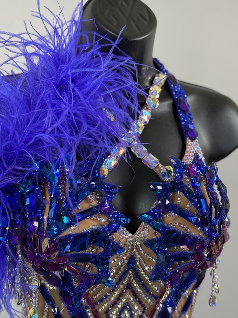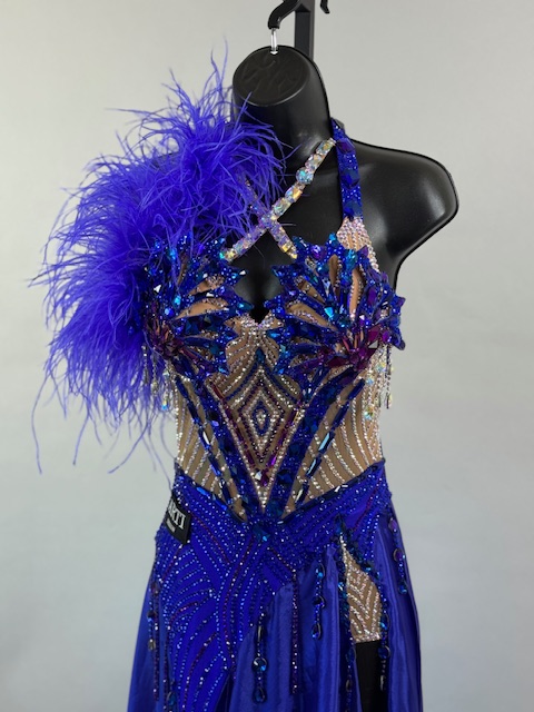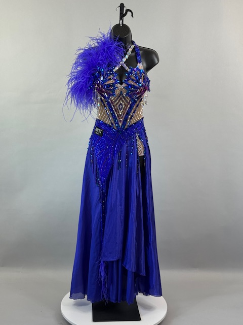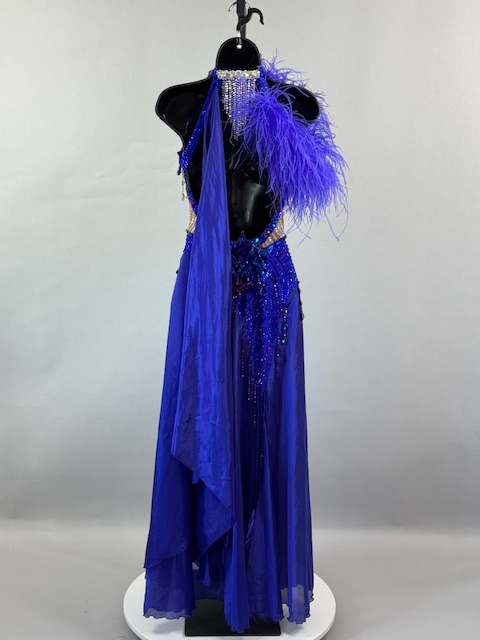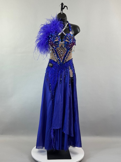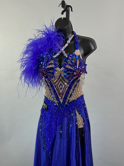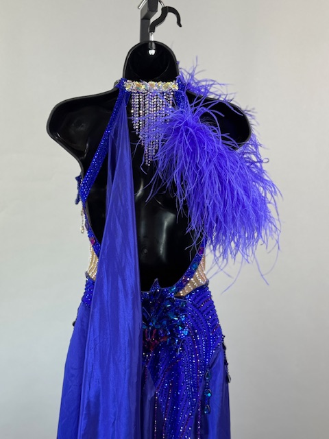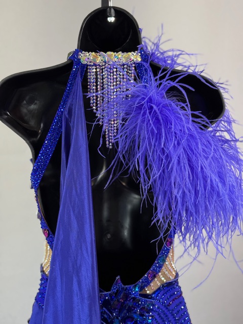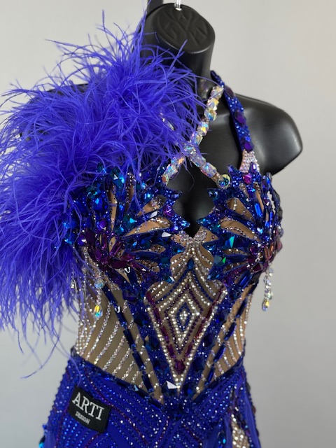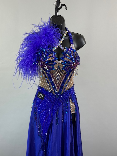 This is a stunning periwinkle purple smooth dress designed by ARTI! It moves amazing on the dance floor. Very unique style, an art piece. Trimmed with Austrian Crystals.