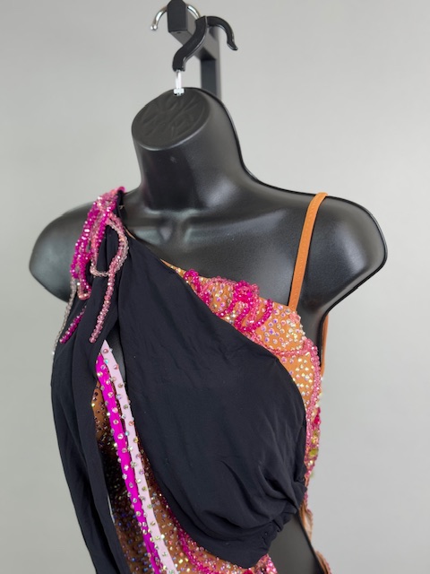 This is a beautiful black and pink beads Rhythm/Latin dress. Gorgeous style on the dance floor. Trimmed with Austrian Crystals.