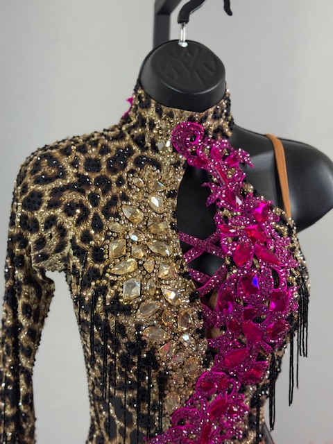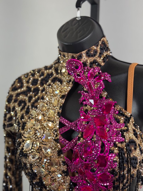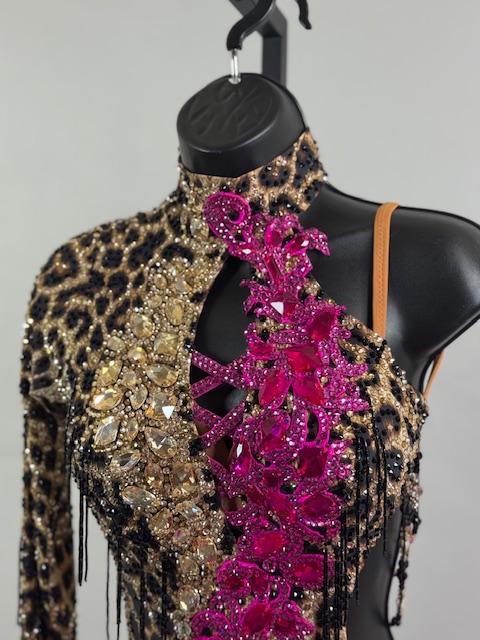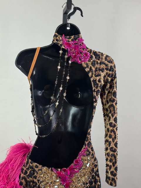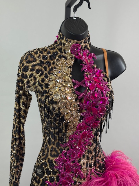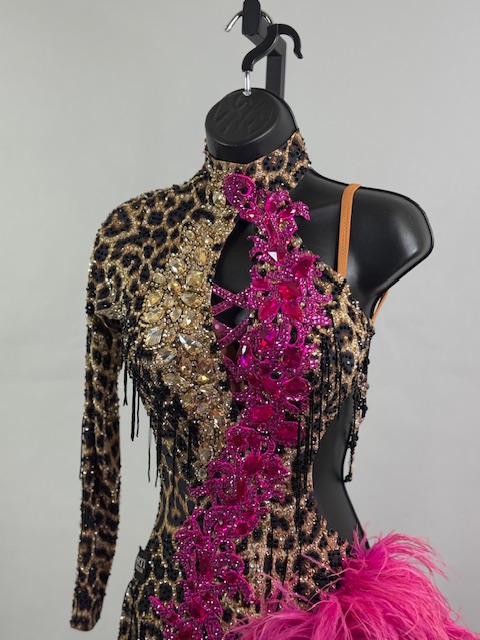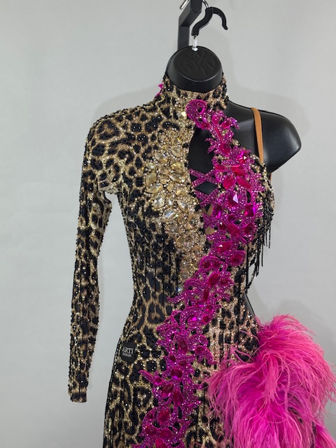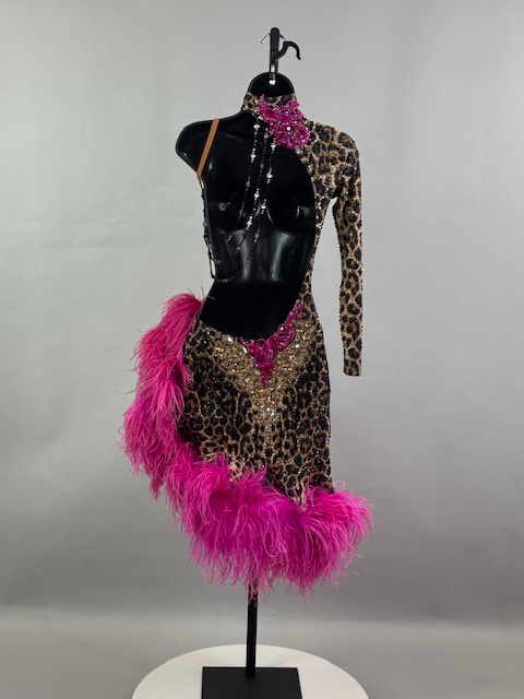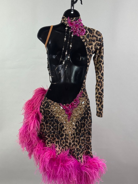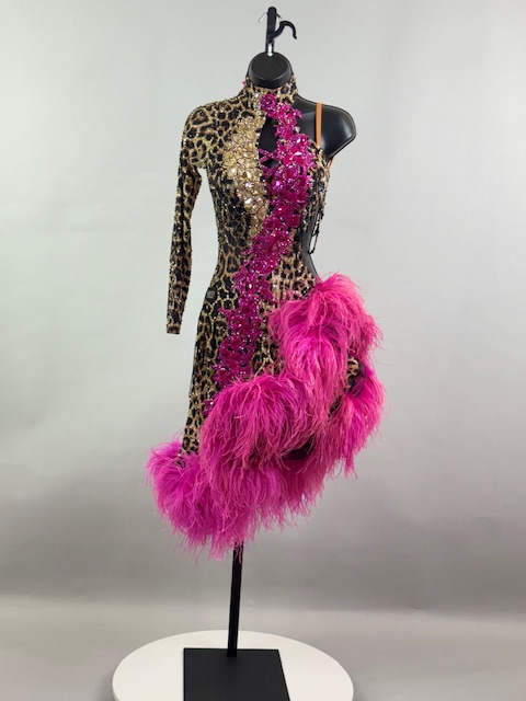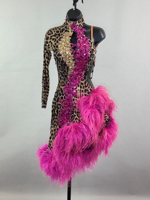 This is a beautiful leopard Rhythm/Latin dress with bright pink feathers designed by ARTI designs. It’s a stunning creation, unique style. Trimmed with Austrian crystals.