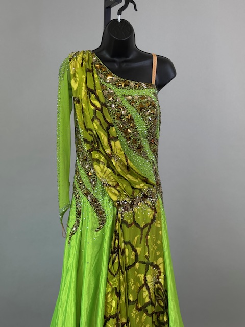 This is a beautiful bright lime green smooth dress designed by Artistry in Motions by Julia Gorchakova. High quality fabric, unique style. It moves amazing on the dance floor. Trimmed with Austrian Crystals.