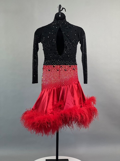 This is a beautiful black and red feathers Rhythm/Latin Dress designed by Venus Dancewear! Unique style, it moves amazing on the dance floor. Trimmed with Preciosa Crystals.