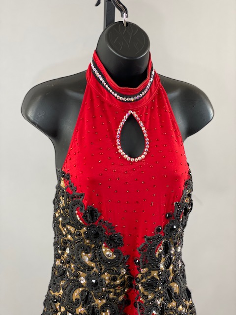 This is a beautiful bright red Rhythm/Latin dress! Fringes moves amazing on the dance floor!. This dress is Korean Crystals.