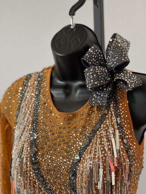 This is a beautiful tan and silver hematite Rhythm/Latin Dress! It moves amazing on the dance floor! It’s Trimmed with Austrian crystals.