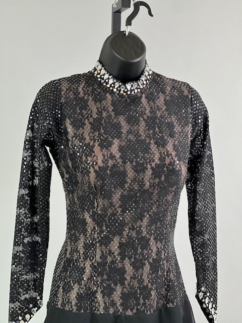 This is a beautiful simple black smooth dress! Great for first competition or showcase. Stones on the neckline are Korean.