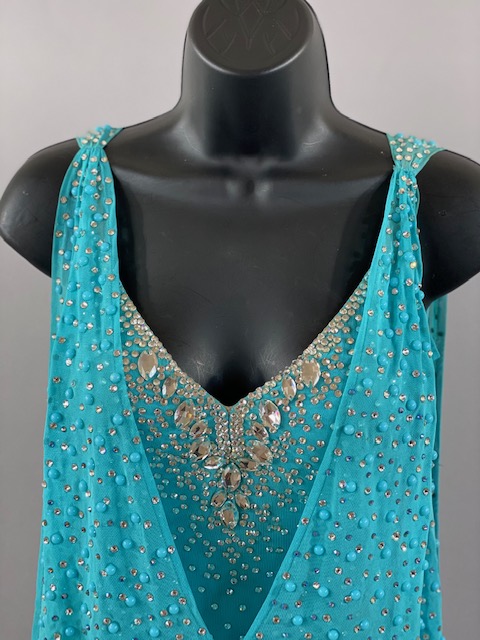 This is an amazing turquoise silver rhythm/latin dress. It moves fantastic on the dance floor. Great for competitions or your next showcase. Trimmed with Austrian Crystals.