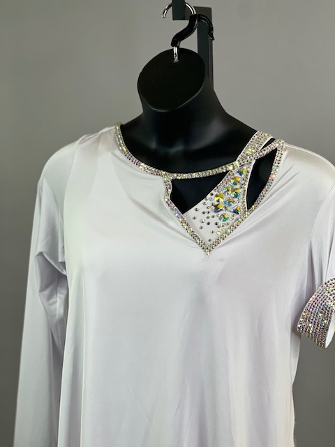 This is a beautiful white Rhythm/Latin Dress! Dress cape creates a great effect on the dance floor. Trimmed with Austrian Crystals.