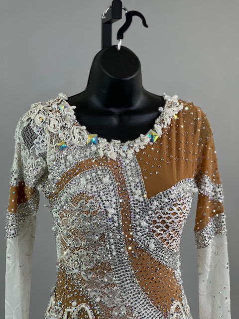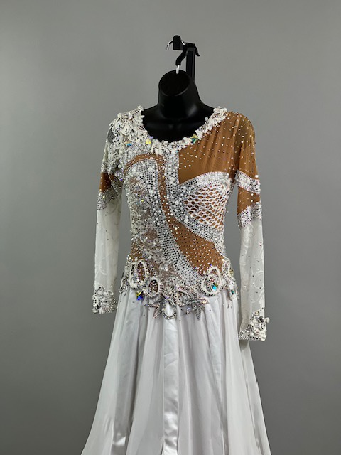 This is a beautiful white and tan smooth dress! This dress is very unique, a true beauty! It moves amazing on the dance floor! Trimmed with Austrian Crystals.