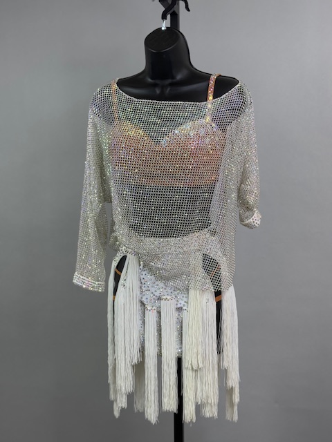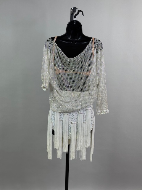 This is a beautiful two piece white Rhythm/Latin dress. Gorgeous style on the dance floor. Trimmed with Austrian Crystals.